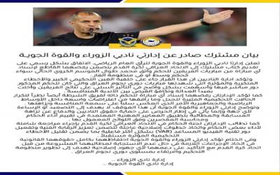 أعلنت إدارتا ناديي الزوراء والقوة الجوية، يوم السبت، الاتفاق بشكل رسمي